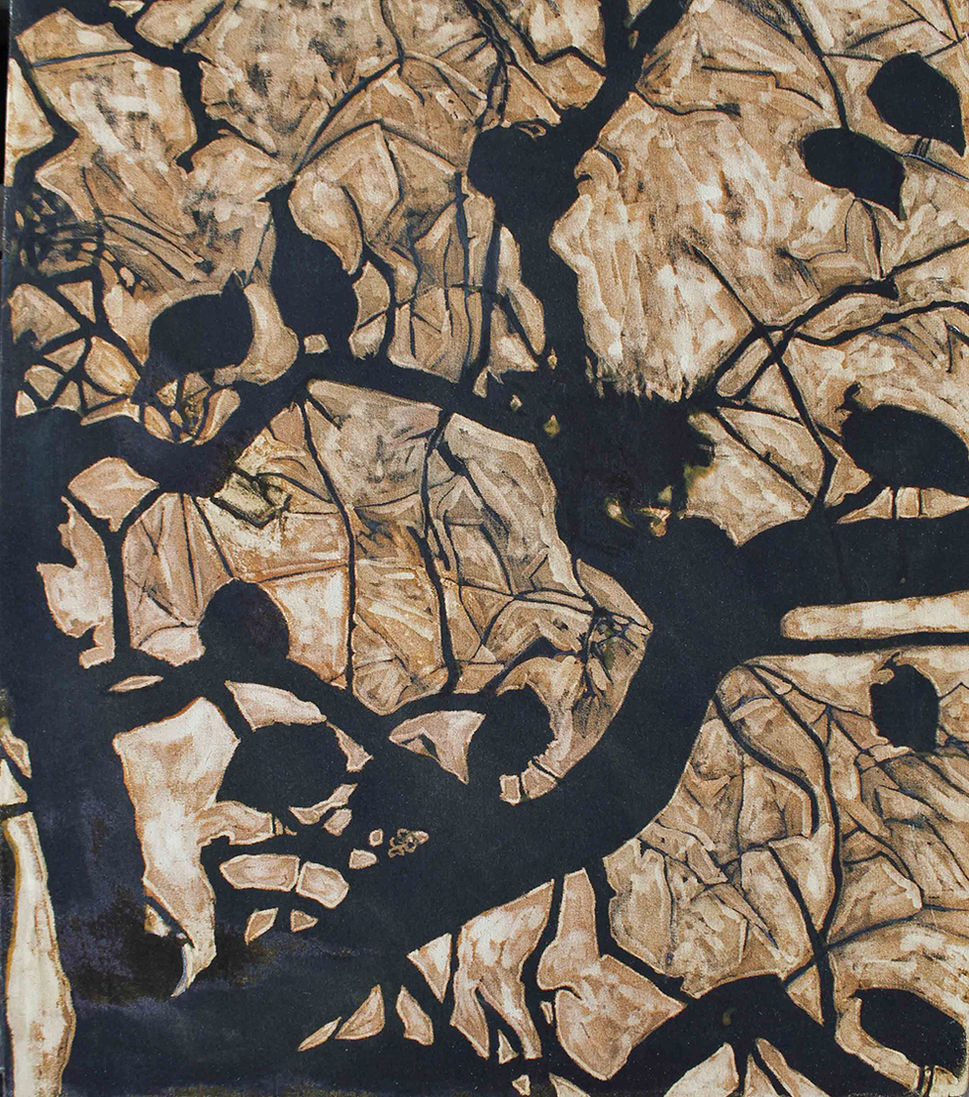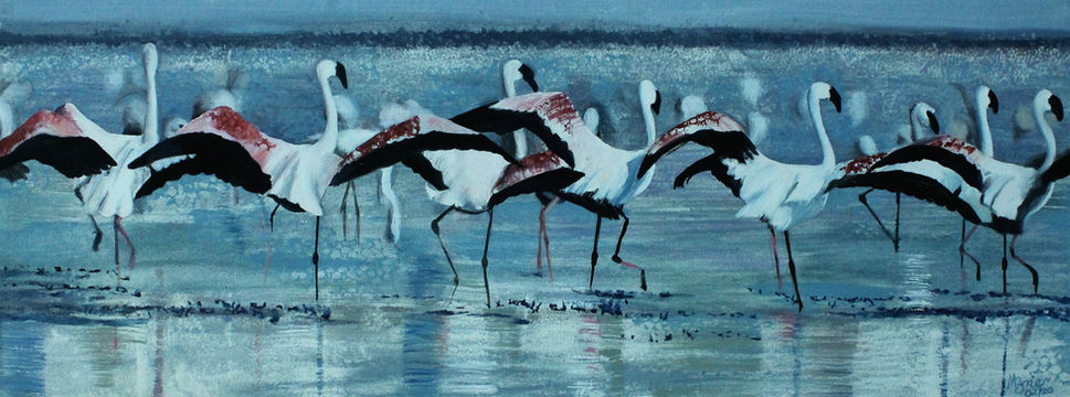 Margie considers Africa's diverse bird life to be as inspirational to her as its larger wildlife; her recent bird paintings have aimed to contrast the fine plumage of her painted birds with looser, more painterly brushstrokes depicting rugged cliff faces and other bird habitats. In other works she has aimed to depict specific bird behaviour through complex, multilayered compositions which provide intriguing detail for closer scrutiny. Margie has also produced a suite of mixed media lino prints of iconic southern African birds. These are shown at the end of this folder and are printed on handmade German archival paper, in a limited edition of 30 prints. Image area is A4 in size excluding the plain border.